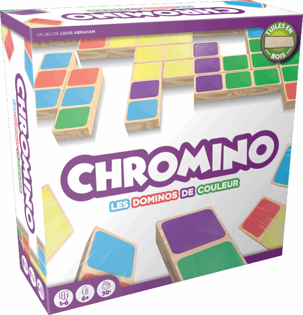 Attention, il est fort ! Dans cette alternative idéale aux dominos, placez vos pièces de couleur en contact avec les Chromino déjà posés. Chaque chromino fait 3 carrés de long, chacun de ces carrés pouvant être d’une couleur différente. Une pièce posée doit être posée à côté d’une autre pièce au moins, de façon à ce que la pièce possède deux couleurs connectées avec ses voisines. Pour l’emporter, posez toutes vos pièces. Simple et fluide, se jouant rapidement, Chromino se pratique aussi bien en famille qu’entre amis, quels que soit l’âge des joueurs ! – Un jeu familial aux règles simples. – L’alternative idéale aux dominos ! – Un nouveau look accentuant le côté familial du jeu.