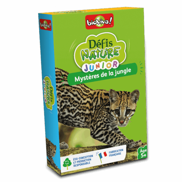 Partez à la rencontre des animaux de la jungle avec Défis Nature Junior – Mystères de la jungle ! Découvrez vos animaux, comparez leurs caractéristiques en vous aidant de la toise graduée et remportez un maximum de cartes !