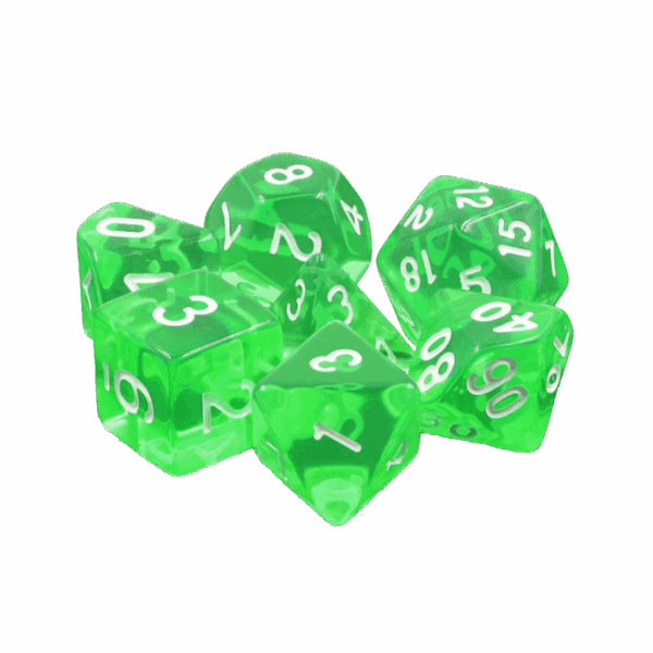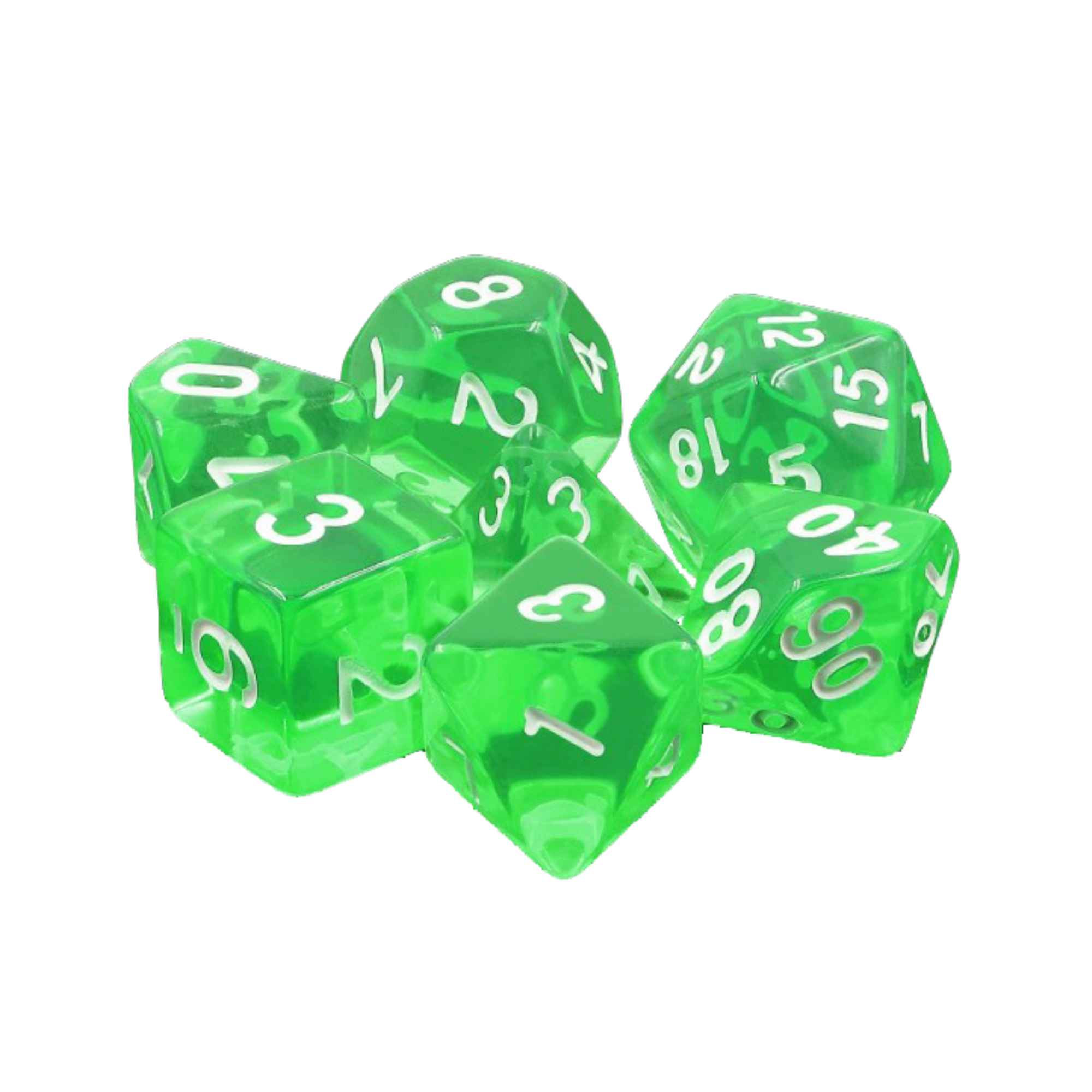 Lot de 7 dés gravés, 4, 6, 8, 10 (unités), 10 (dizaines), 12 et 20 faces.