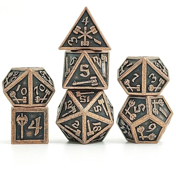 Lot de 7 dés gravés, 4, 6, 8, 10 (unités), 10 (dizaines), 12 et 20 faces.