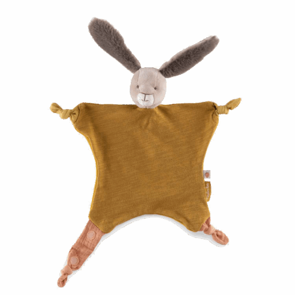 Doudou plat lapin ocre avec attache-tétine. Compagnon bi-matières réconfortant aux grandes oreilles toutes douces. Noué à chaque coin, il est facile à saisir par les petites mains et sera un allié précieux pour bébé.