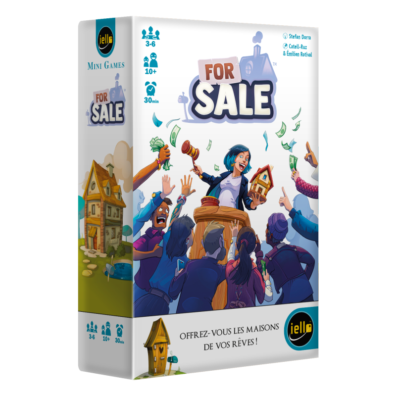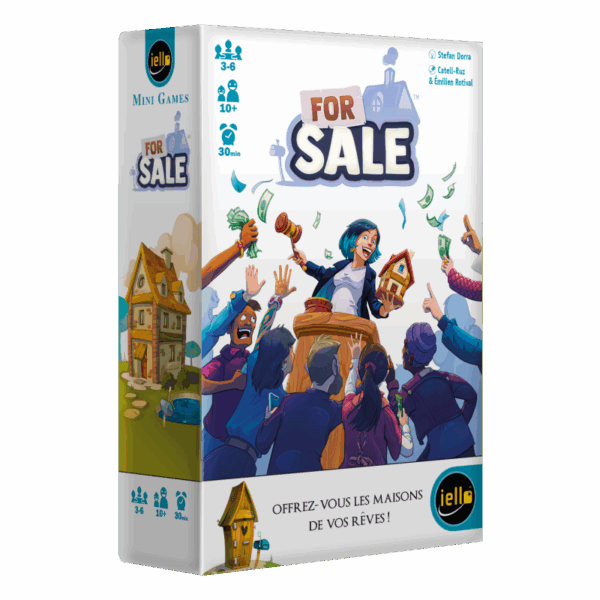 Les agents immobiliers sont des requins ? Prouvez que vous êtes le meilleur ! Redécouvrez le plaisir de For Sale, le célèbre jeu d’enchères, qui fait son entrée dans la célèbre collection « Mini Games » (Schotten Totten, Time Bomb…). Dans For Sale, les joueurs incarnent des agents qui achètent des maisons au plus bas prix… puis tentent de les revendre en faisant d’énormes profits ! Sauront-ils estimer au mieux la valeur des biens pour remporter les plus gros chèques ? Achetez, vendez ! Le jeu se déroule en deux phases : la phase d’Achat et la phase de Vente, qui se déroulent chacune en plusieurs manches. Dans la phase d’achat, les joueurs enchérissent les uns après les autres. Lorsqu’un joueur passe, il récupère la carte Maison de plus petite Valeur encore disponible, et récupère la moitié de son enchère. Le dernier joueur, qui récupère donc la carte avec la plus grande valeur, dépense quant à lui la totalité de son enchère ! Dans la phase de Vente des maisons, les joueurs choisissent chacun une carte Maison de leur main et la révèlent simultanément. Le joueur qui a joué la Maison avec la plus grande valeur prend le chèque le plus élevé, et ainsi de suite. Lorsque toutes les cartes Maison ont été vendues et que tous les chèques ont été ramassés, le joueur le plus riche est déclaré vainqueur. Une référence du jeu d’enchères Initialement sorti en 1997, ce jeu de Stefan Dorra est devenu une véritable référence du jeu d’enchères ouvertes et fermées, dont le succès ne se dément pas avec les années. Ce jeu mixe l’efficacité des classiques du genre à la subtilité de mécanismes originaux, afin de créer un combo parfait entre accessibilité, fun et stratégie. C’est simple, fûté et jubilatoire !
