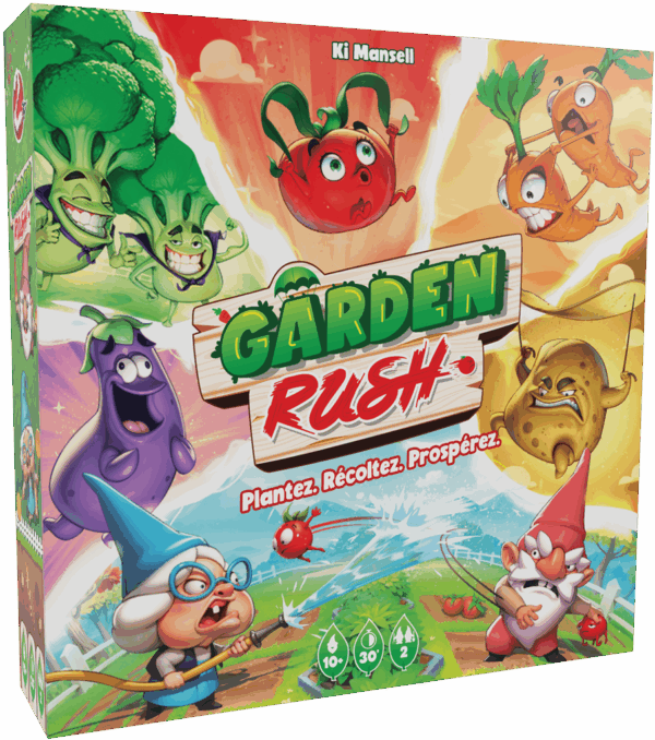 Garden Rush est un jeu de placement de tuiles dans un potager, le tout contenu dans une boîte qui sert de plateau de jeu.