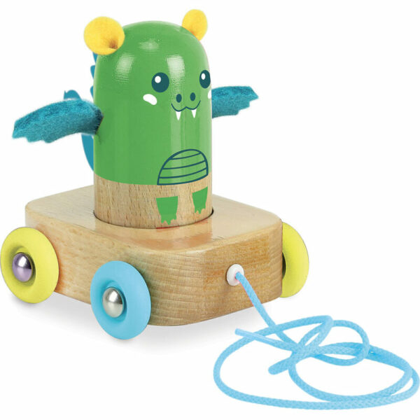 Dédé le dragon est un jouet à traîner en bois – 100% Made in France. Dédé est une maracas à secouer, à promener dans son wagon ou à collectionner parmi les autres personnages de la collection « Les P’tits roulis ». En bois massif laqué et vernis, ailes, oreilles et queue en feutrine. Roues en plastique multicolore.