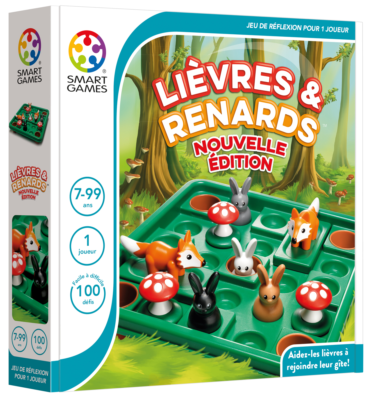 Plateau de jeu portable avec couvercle quatre lapins, trois champignons, deux renards, un livret avec 100 défis et solutions.