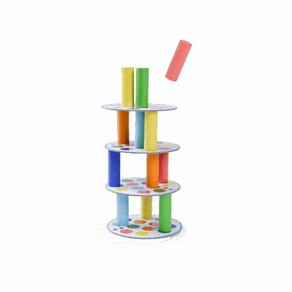 Construisez la tour la plus haute possible. A tour de rôle, ajoutez les cylindres en fonction de la couleur indiquée par le dé sur les plateaux ronds… Voir la description complète