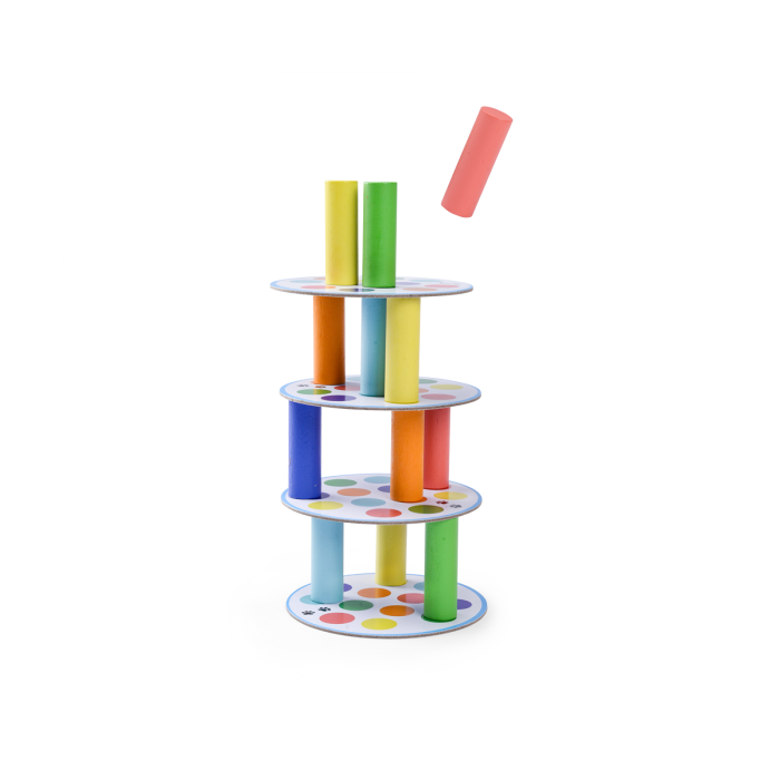 Construisez la tour la plus haute possible. A tour de rôle, ajoutez les cylindres en fonction de la couleur indiquée par le dé sur les plateaux ronds, tout en évitant que la tour ne tombe. Jeu de la collection Les Loufoques. 2 joueurs et +. 4 ans et +