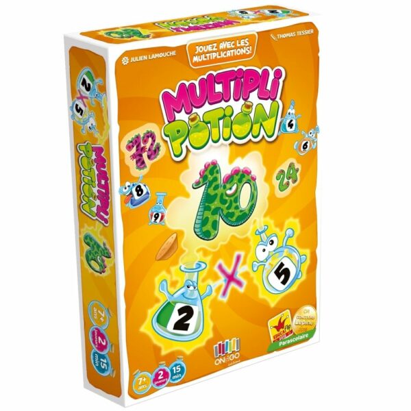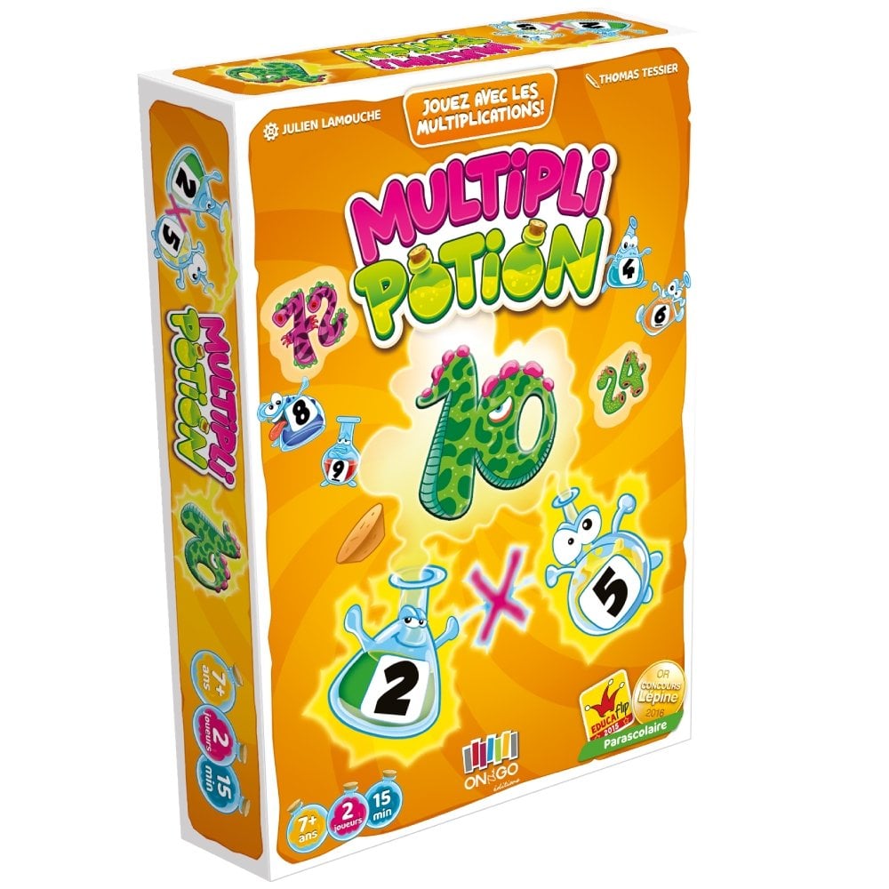 Multiplipotion est un jeu de cartes pour apprendre et réviser les tables de multiplication. « Pour ceux qui connaissent les tables de multiplication… ou pensent les connaître. » Dans Multipli Potion, vous incarnez un magicien dont le but est d’être le premier à capturer 5 monstres adverses. Pour cela, multipliez les nombres inscrits sur vos potions magiques pour obtenir le résultat correspondant à la valeur d’un monstre ennemi. Mais soyez vigilant…ne ratez pas une occasion d’attraper un monstre de votre adversaire et prenez garde à ne pas vous faire capturer trop facilement les vôtres.