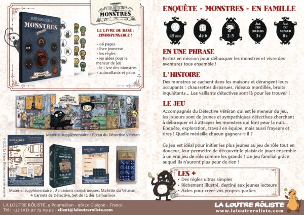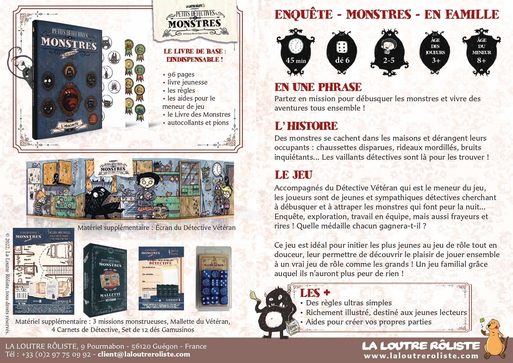 Petits Détectives de Monstres est un jeu de rôle pour enfants à partir de 3 ans, dans lequel ils joueront de jeunes et sympathiques détectives cherchant à débusquer et à attraper les monstres qui leur font peur la nuit…