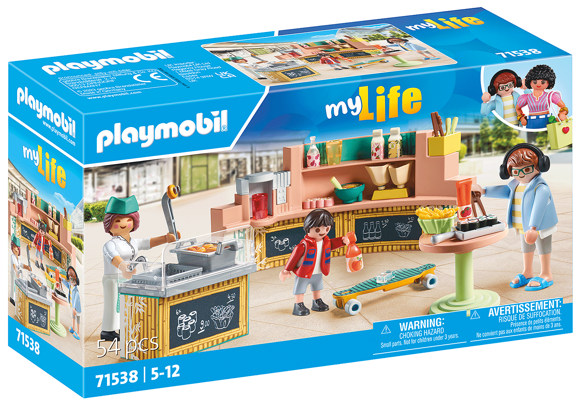 – Ce set comprend trois personnages PLAYMOBIL, un comptoir de vente, un grill avec friteuse et un panier, un évier, une table de bistro, des gobelets et bien d’autres accessoires.