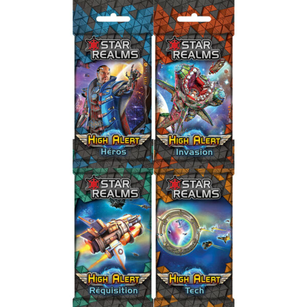 Avec cette extension, il y aura à disposition quatre packs de 12 cartes Star Realms : High Alert. Héros : contient de nouvelles cartes de héros multifactions ! Invasion : propose de nouveaux vaisseaux et bases avec le mécanisme de Double Allié ! Réquisition : de nouveaux vaisseaux et bases dont l’acquisition coûte 1 trade de moins pour chaque carte de leur faction jouée au cours du tour ! Tech : présente le nouveau type de carte Tech, qui entre directement en jeu lorsqu’elle est acquise et vous donne une capacité permanente que vous pouvez activer une fois par tour avec un échange ! High Alert : Héros Si vous aimez autant que moi déclencher les capacités des alliés, alors vous allez adorer les nouveaux héros multifactions de High Alert : Heroes ! Biodroid Otto est le droïde que vous recherchez ! Lorsque vous achetez un Héros dans la rivière, il entre en jeu immédiatement. Ils déclenchent vos capacités d’allié ! À n’importe quel moment de votre tour, vous pouvez choisir de le mettre au rebut pour gagner l’une de ces deux capacités. High Alert : Invasion De nouvelles cartes qui grâce à leurs capacités d’allié et de double allié qui vous permettront de tirer jusqu’à trois cartes ! Trois cartes ? C’est bien ça ! Lorsque vous les jouez, vous gagnez immédiatement des points de combat et tirez une carte. Si vous avez joué une autre carte de la même couleur que ces nouvelles cartes pendant ce tour, ou si vous avez une base en jeu, vous tirez une autre carte. Et si vous déclenchez l’insaisissable capacité Double Allié en jouant deux autres cartes de cette couleur ce tour-ci… vous l’avez deviné ! Vous tirez une autre carte ! High Alert : Réquisition La synergie est indispensable pour déclencher certaines capacités et prendre l’avantage sur votre adversaire, mais jamais l’unité de faction n’a été aussi rentable ! Imaginez toutes les possibilités de combo… De nouvelles bases pour comboter avec le jeu de base et créer de nouvelles synergies… High Alert : Tech Un nouveau type de carte ? ! C’est sûr ! Laisse-moi te présenter la Tech… Lorsque tu acquiers une carte Tech, elle entre directement en jeu et te donne une capacité permanente que tu peux utiliser une fois par tour avec le Commerce !