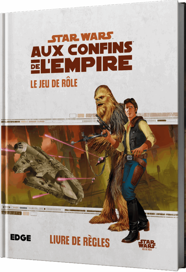 Aux Confins de l’Empire (448 pages couleurs, format A4, couverture rigide) est un jeu de rôle complet permet de découvrir la frontière turbulente de l’Empire, où la seule loi est celle du plus fort. Il faut fuir les agents impériaux, berner Hutts et scélérats et passer en vitesse lumière dans le tas de ferraille le plus rapide de la galaxie !